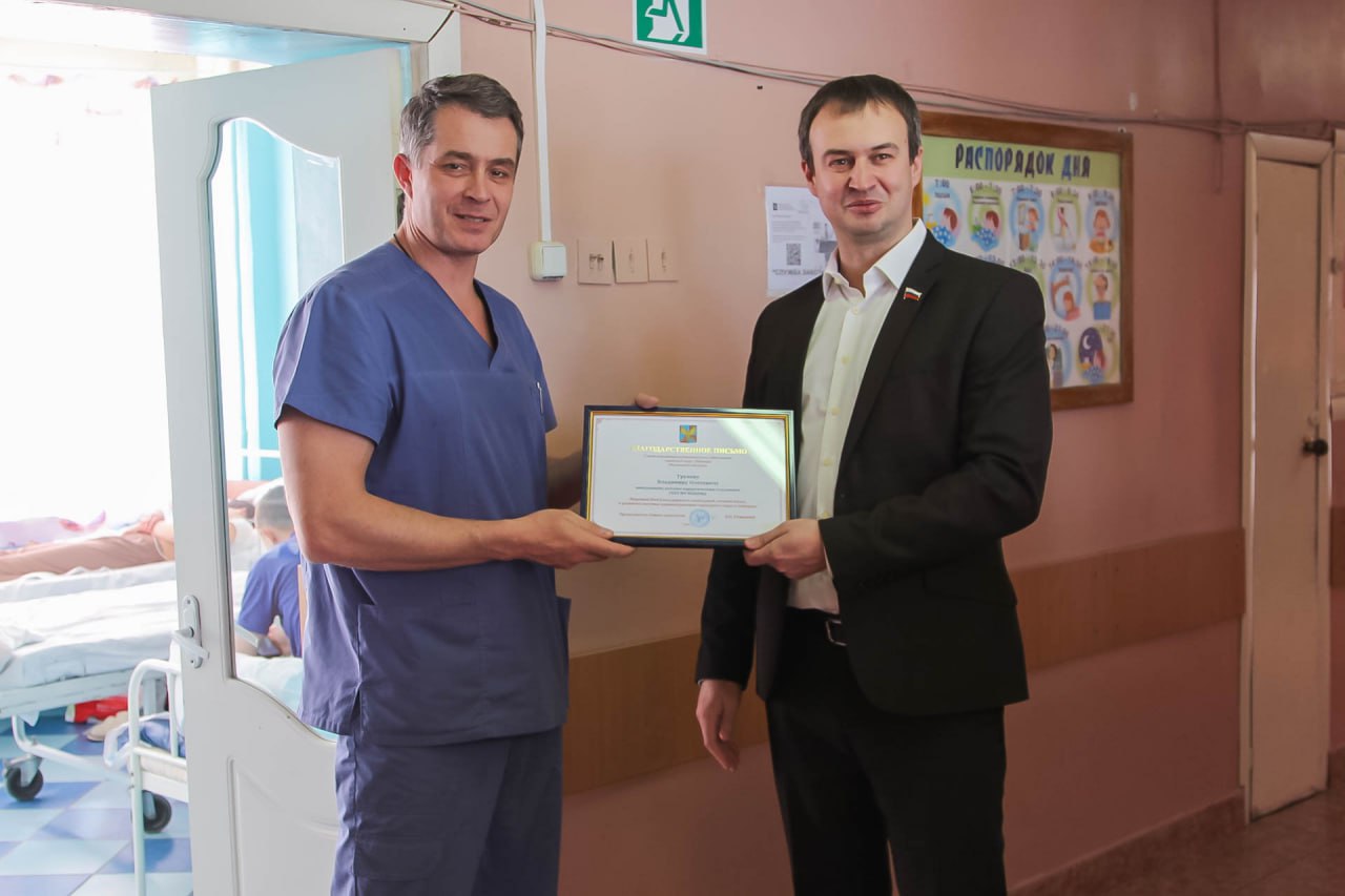 Депутат фракции «Единая Россия» городского округа Люберцы Сергей Ситников вручил благодарственное письмо заведующему детским хирургическим отделением Люберецкой областной больницы Владимиру Трунову в рамках партпроекта «Здоровое будущее».