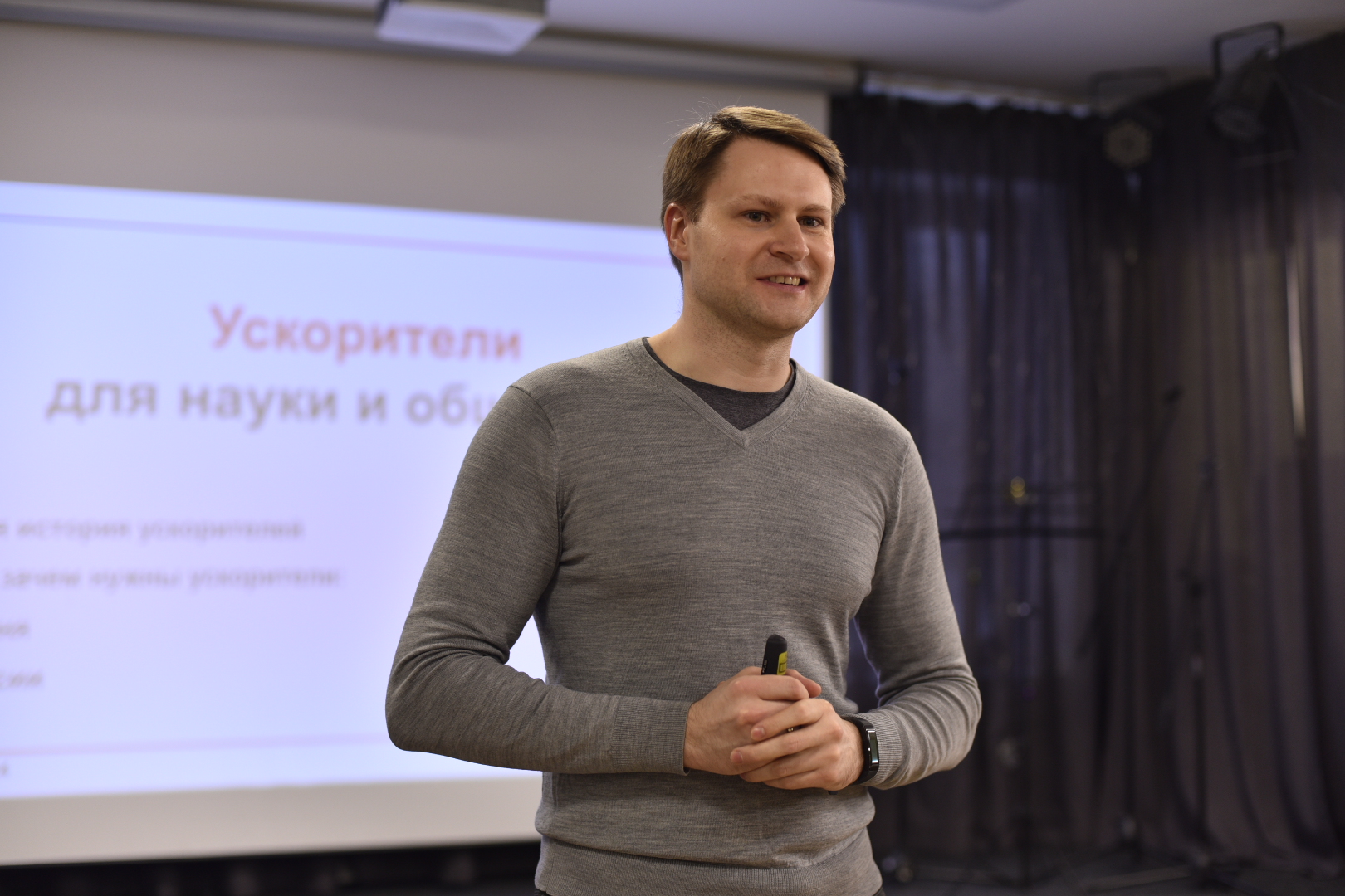 Днём 23 января в Доме учёных на лекции Сергея Гаврилова «Ускорители для науки и общества» тоже был полный зал.