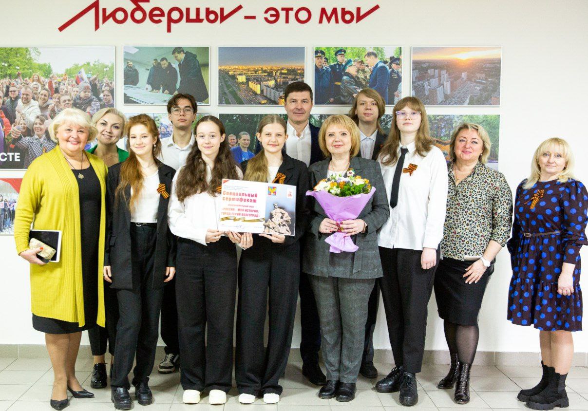 Глава городского округа Люберцы Владимир Волков за победу в заключительном этапе большой исторической викторины вручил команде школы №8 сертификат на поездку в город-герой Волгоград.