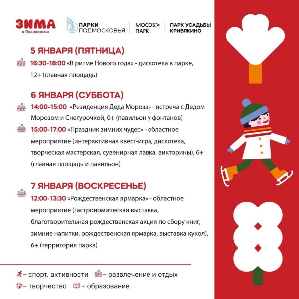 В парке Кривякино работает резиденция Деда Мороза, сувенирная лавка, подготовлена развлекательная программа (интерактивный квест, дискотека, викторина.