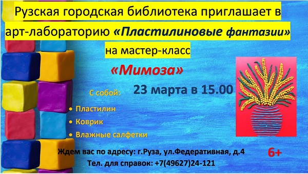 В арт-лаборатории «Пластилиновые фантазии» Рузской городской библиотеки 23 марта в 15 часов состоится мастер-класс «Мимоза».