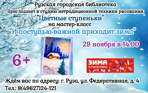 29 ноября в студии нетрадиционной техники рисования «Цветные ступеньки» Рузской городской библиотеки состоится мастер-класс «И поступью важной приходит зима». Начало в 14 часов.