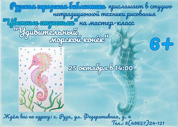 25 октября в студии нетрадиционной техники рисования «Цветные ступеньки» Рузской городской библиотеки пройдет мастер-класс «Удивительный морской конёк». Начало в 14 часов.