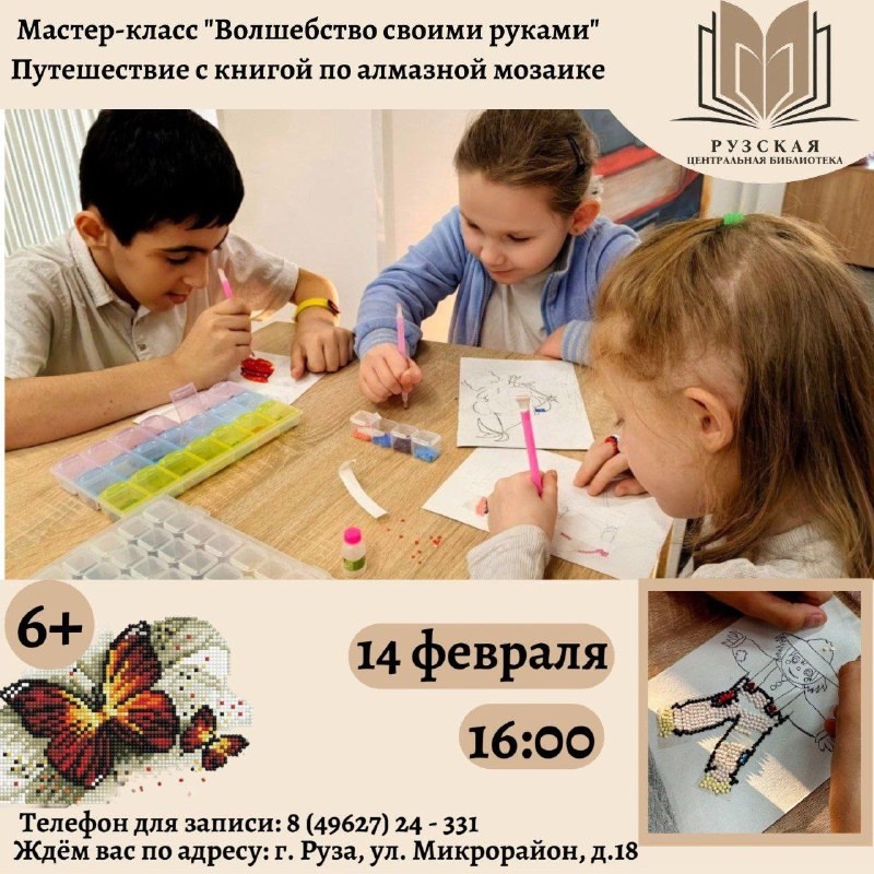 Рузская центральная библиотека приглашает всех желающих на мастер-класс «Волшебство своими руками» 14 февраля в 16:00. Вас ждет увлекательное путешествие с книгой по алмазной мозаике.