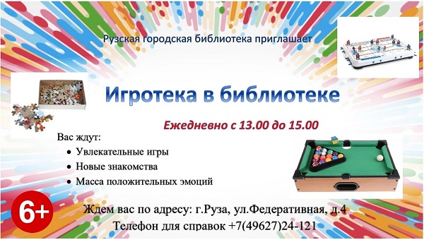 Игротека «Территория игр» состоится в Рузской городской библиотеке 13 января с 13 до 15 часов.