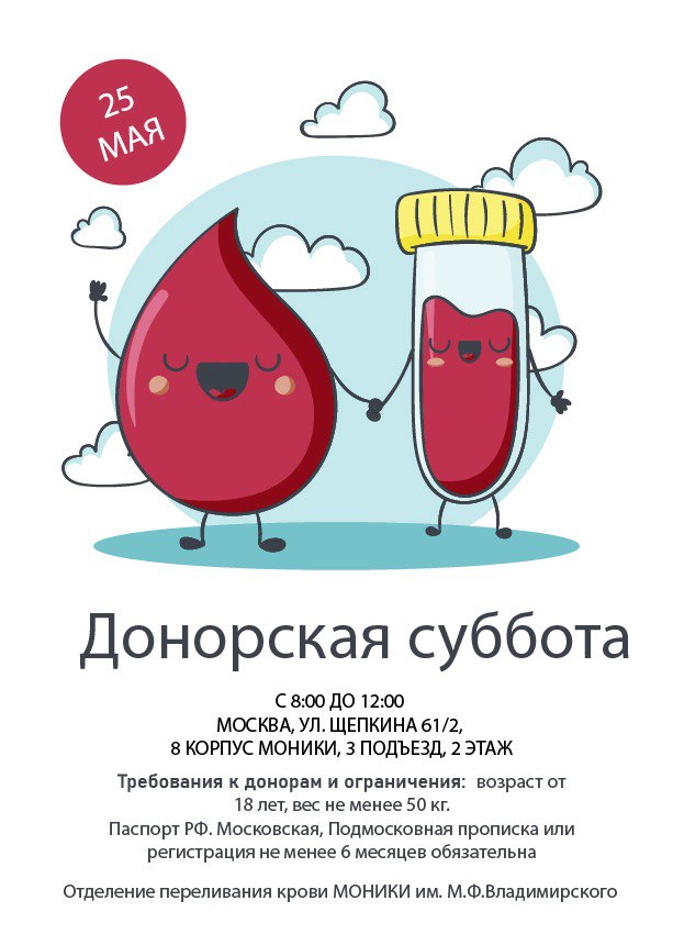 25 МАЯ 2024 года - ДОНОРСКАЯ СУББОТА! Ждем Вас с 8-00 до 12-00. по адресу: Москва, ул.Щепкина 61/2,